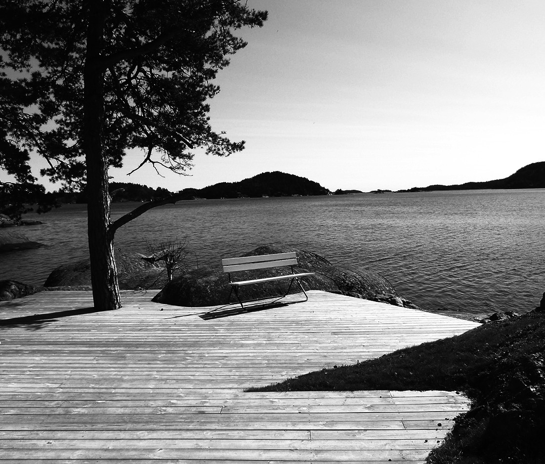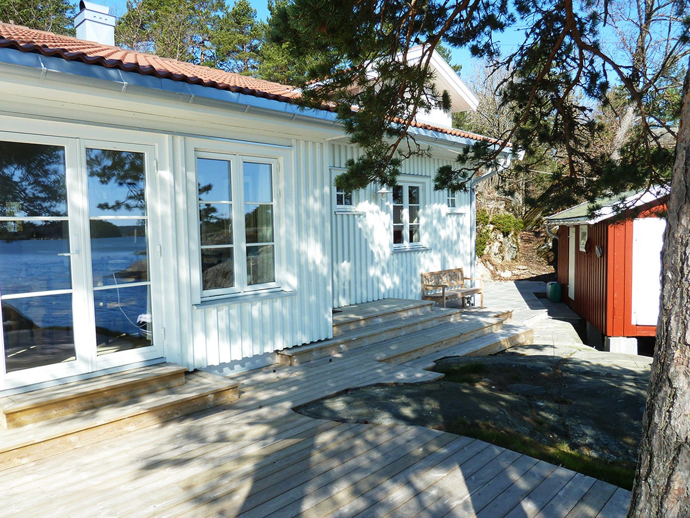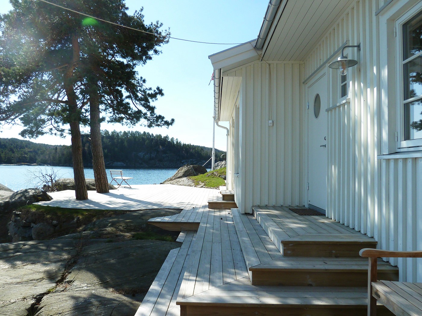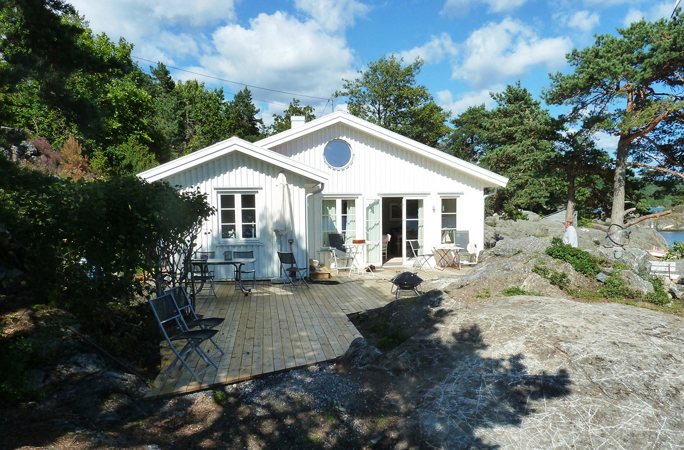 Erstatningshytte utformet i et tradisjonelt formspråk på svaberg nært tilknyttet sjøen. Utført med stående hvitbeiset lektekledning.