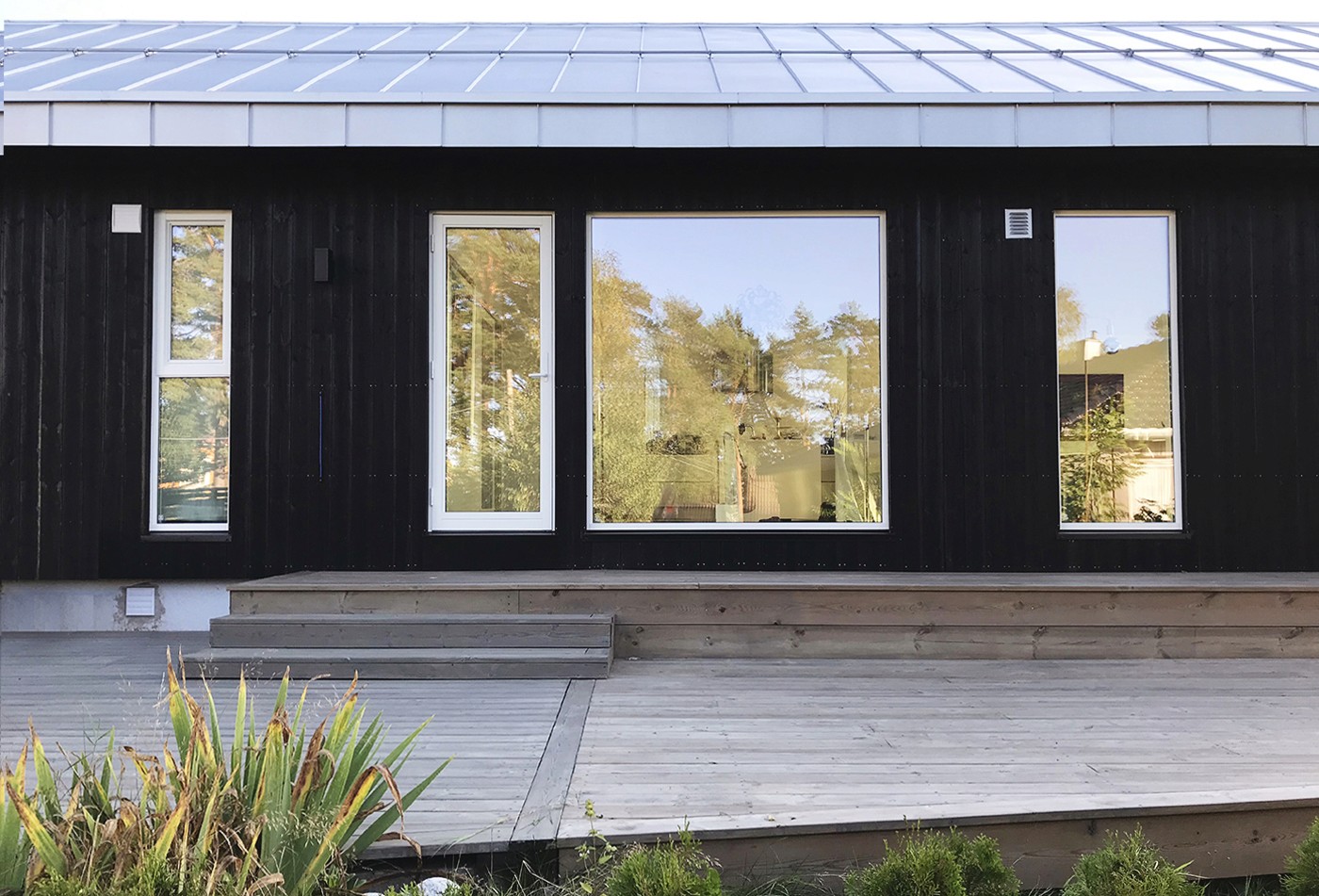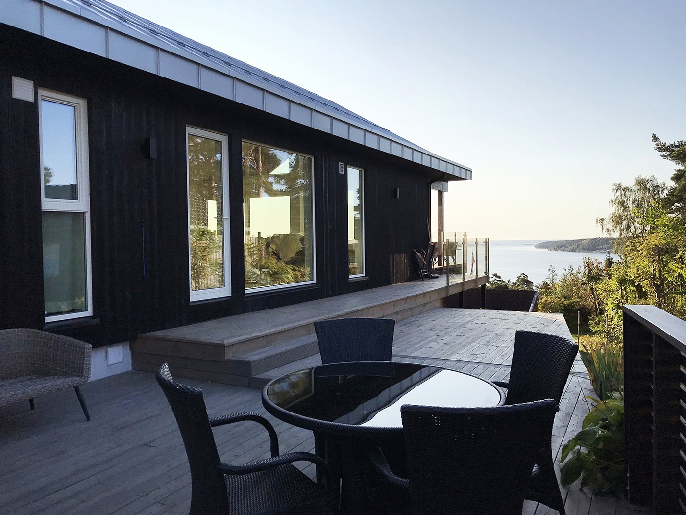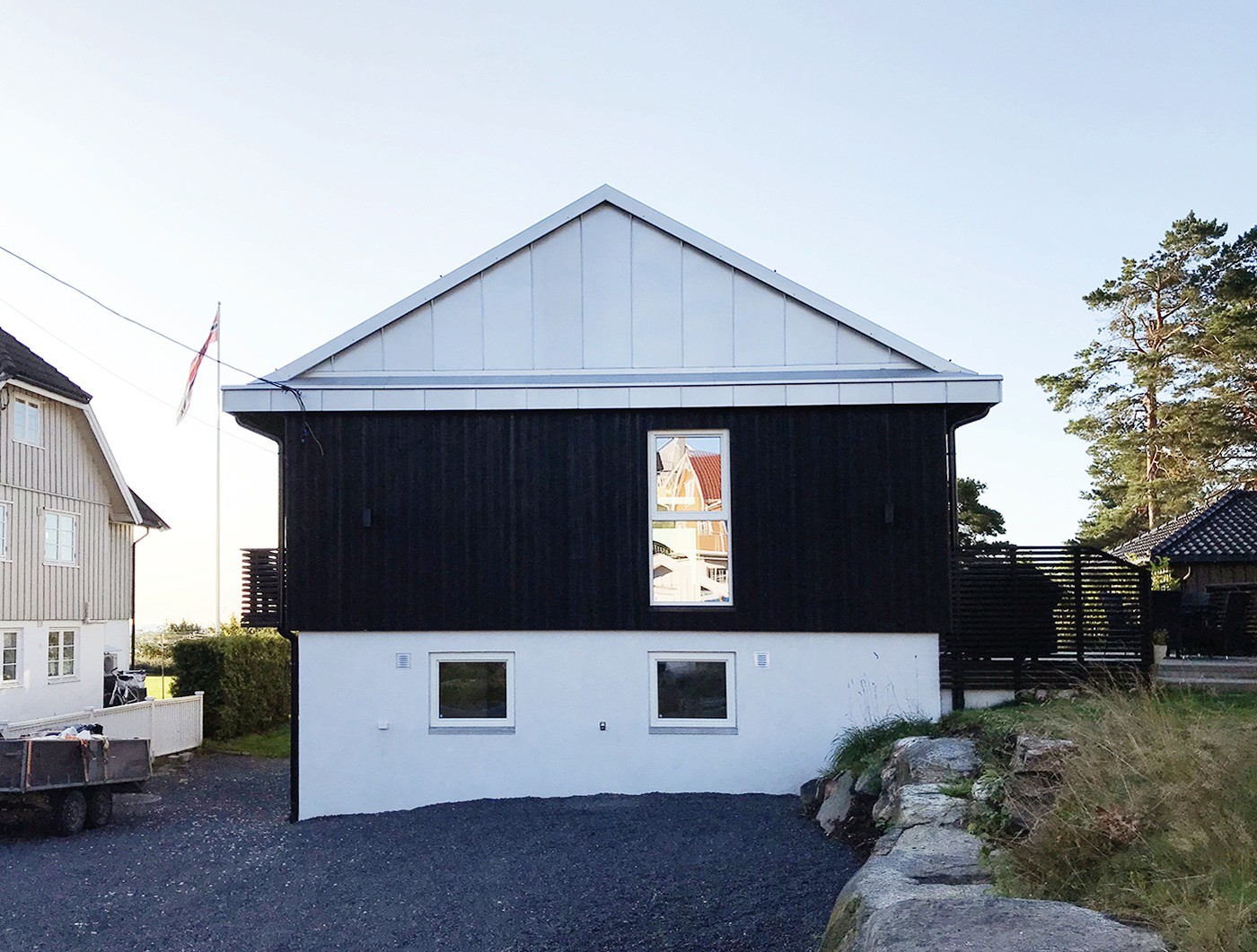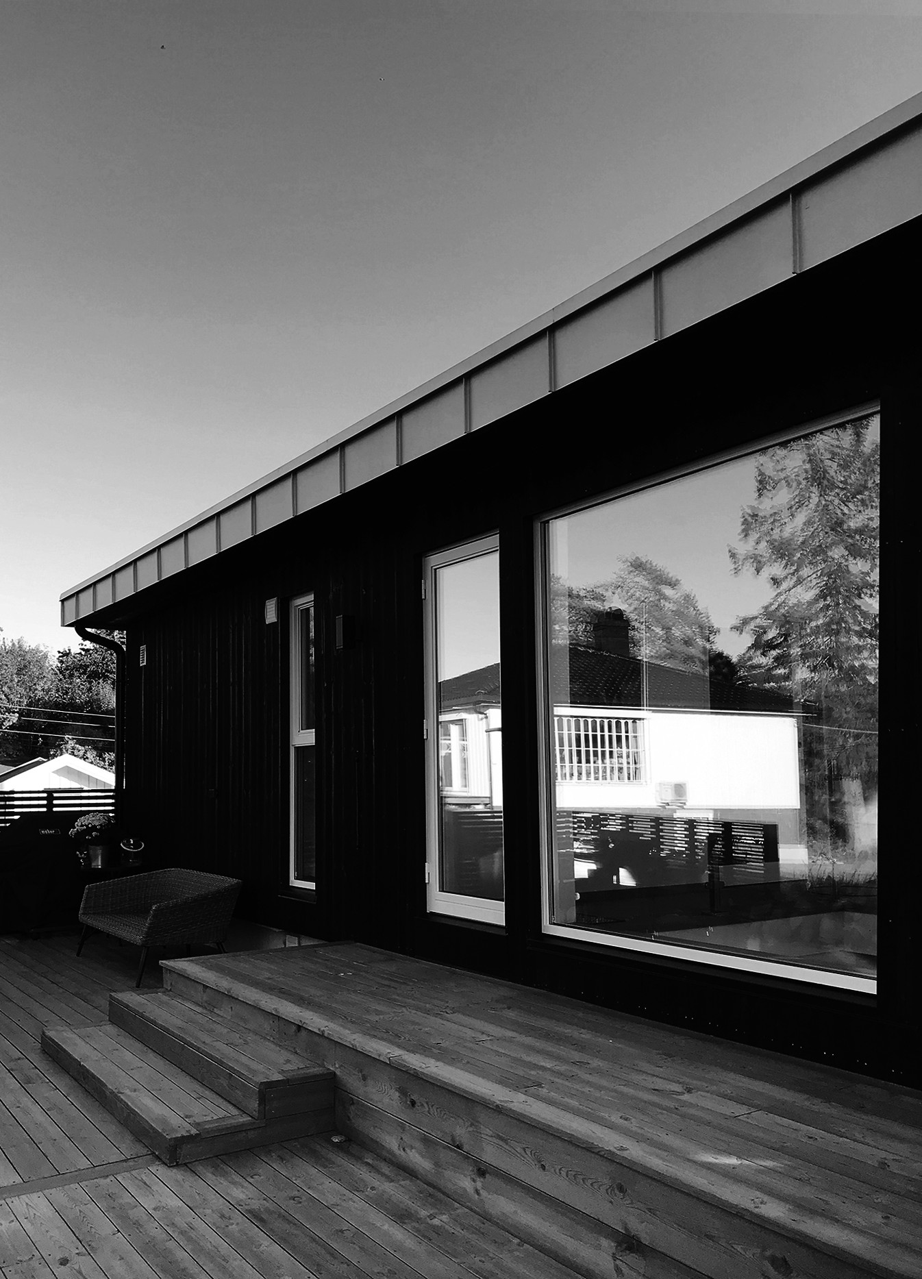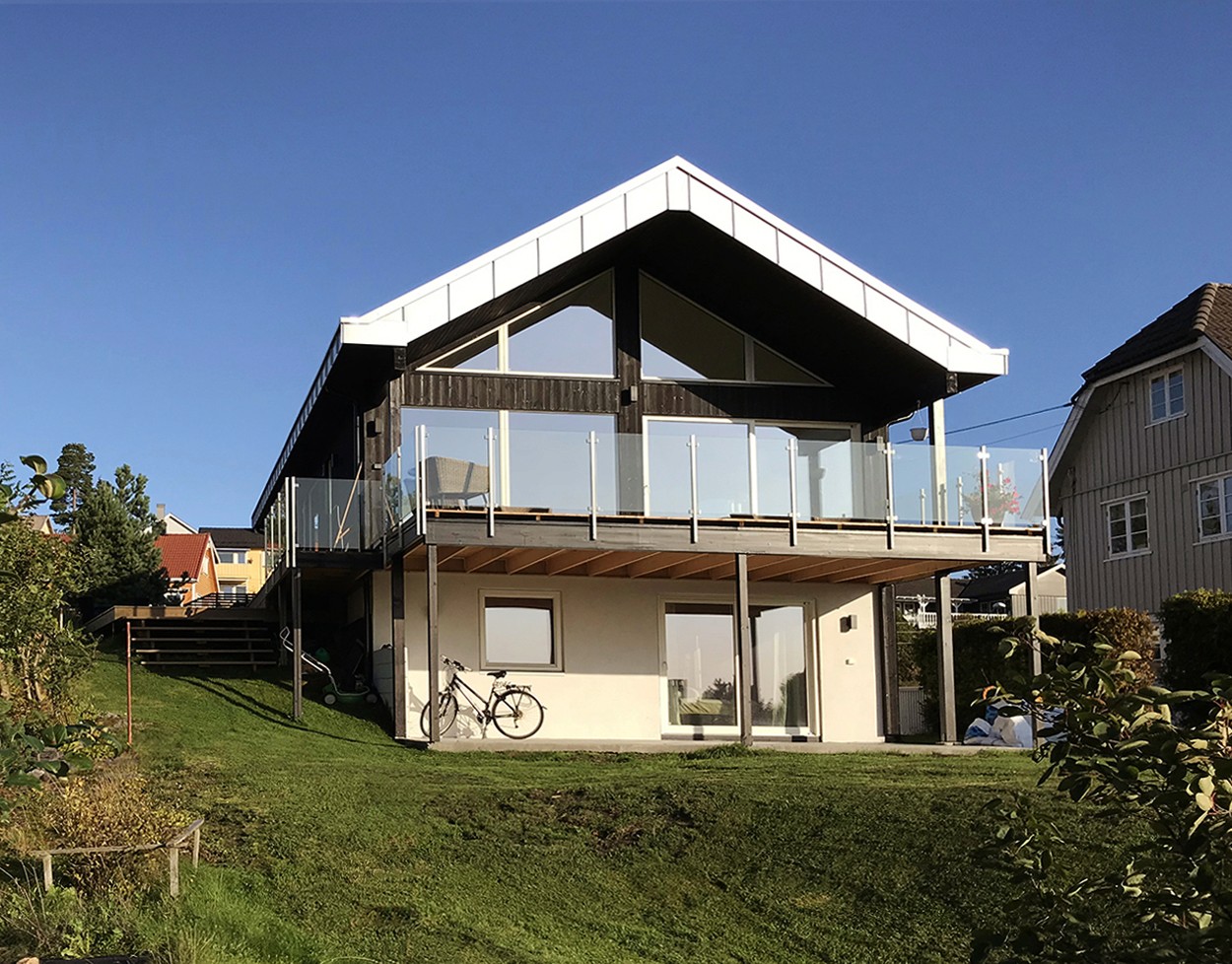 Ombygget enebolig på Vestheia. Boligen har fått åpen planløsning, og uteområdene er knyttet bedre sammen med huset. Saltaket er videreført, nå med et mer moderne arkitektonisk formspråk.